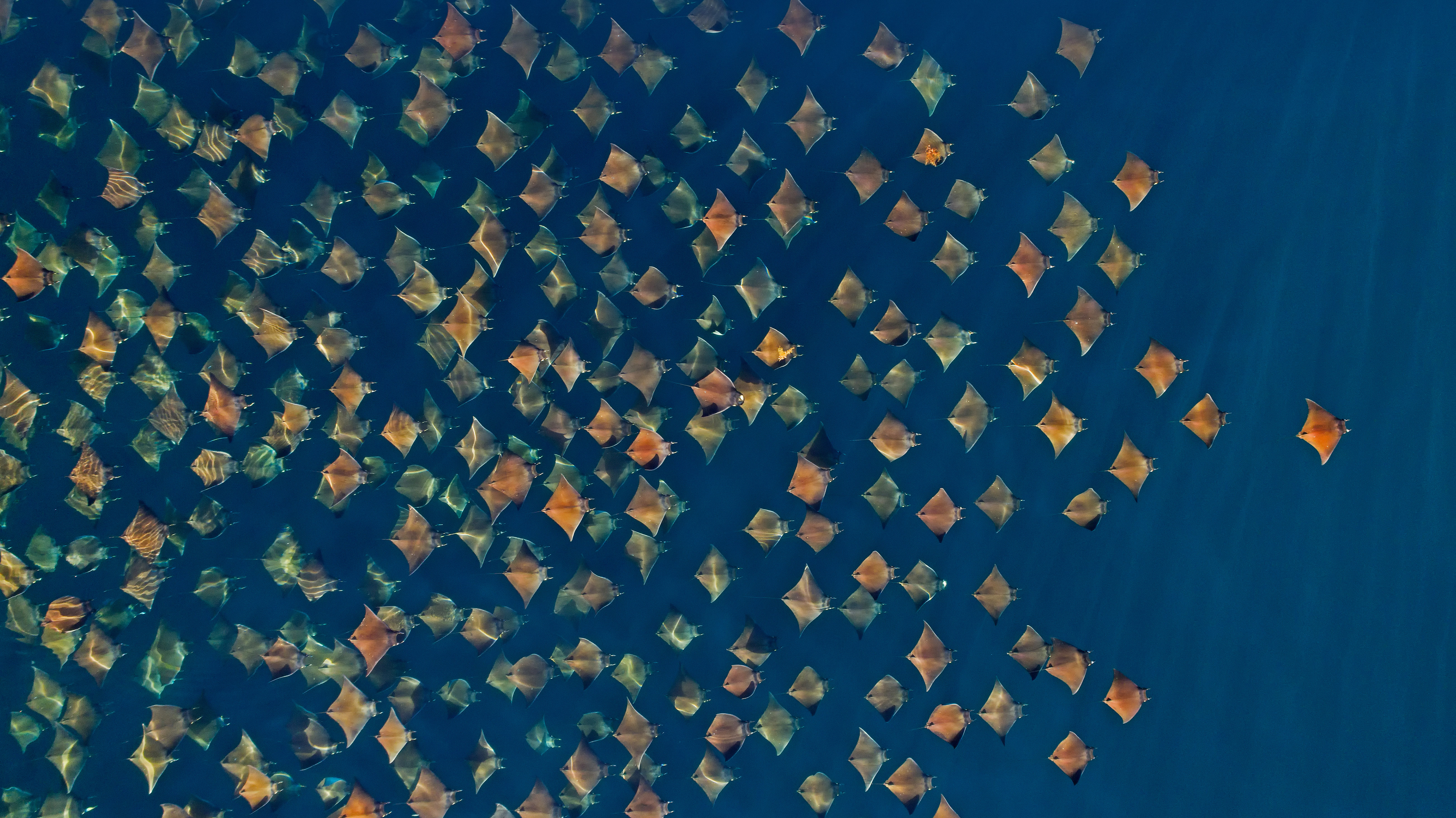 Large school of Munk's devil rays seen from the air, Gulf of 加利福尼亚州, 墨西哥 (© Mark Carwardine/Minden Pictures)