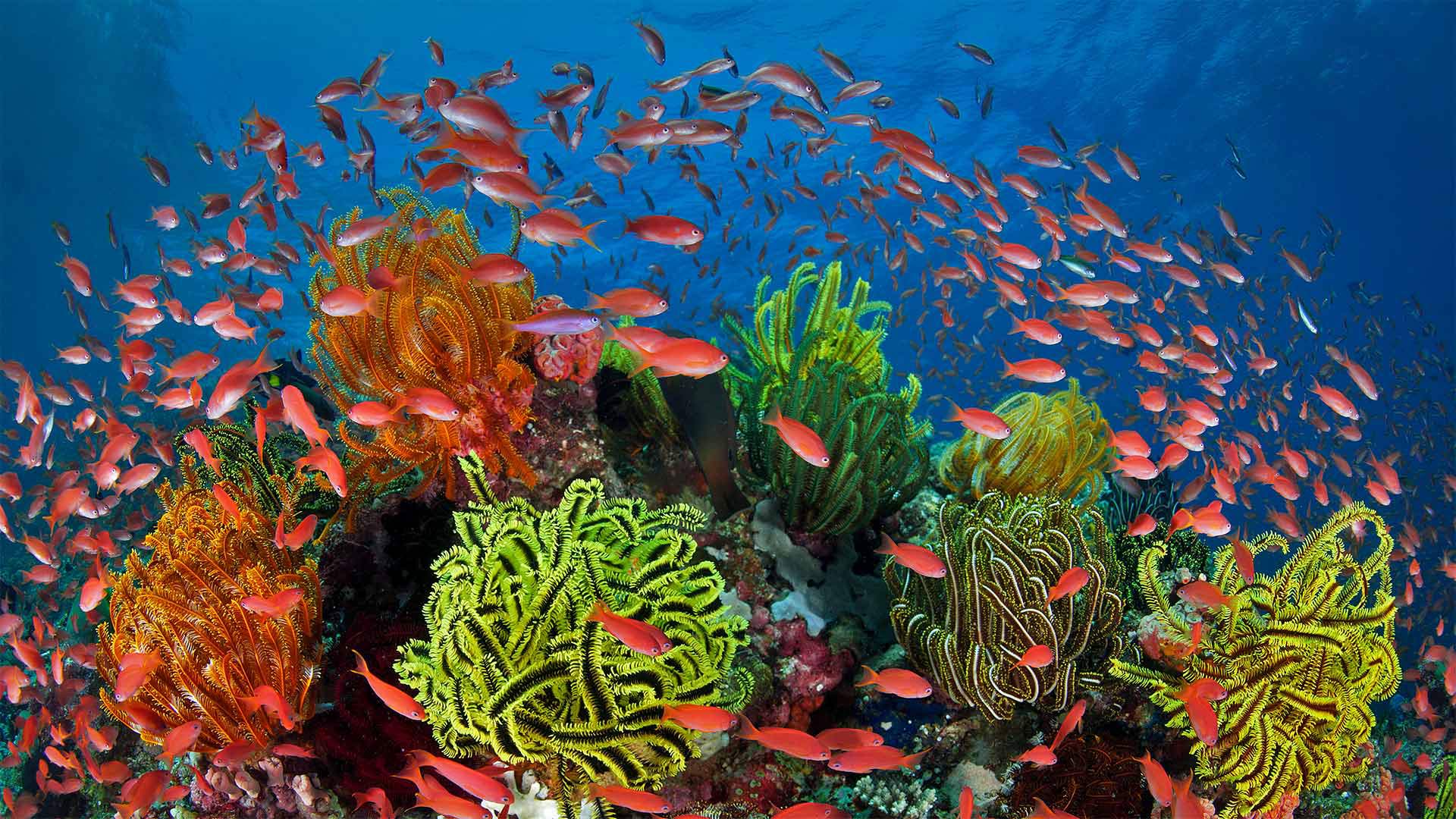 School of sea goldies with feather stars, Great Barrier Reef, Queensland, 澳大利亚 (© 加里 Bell/Minden Pictures)