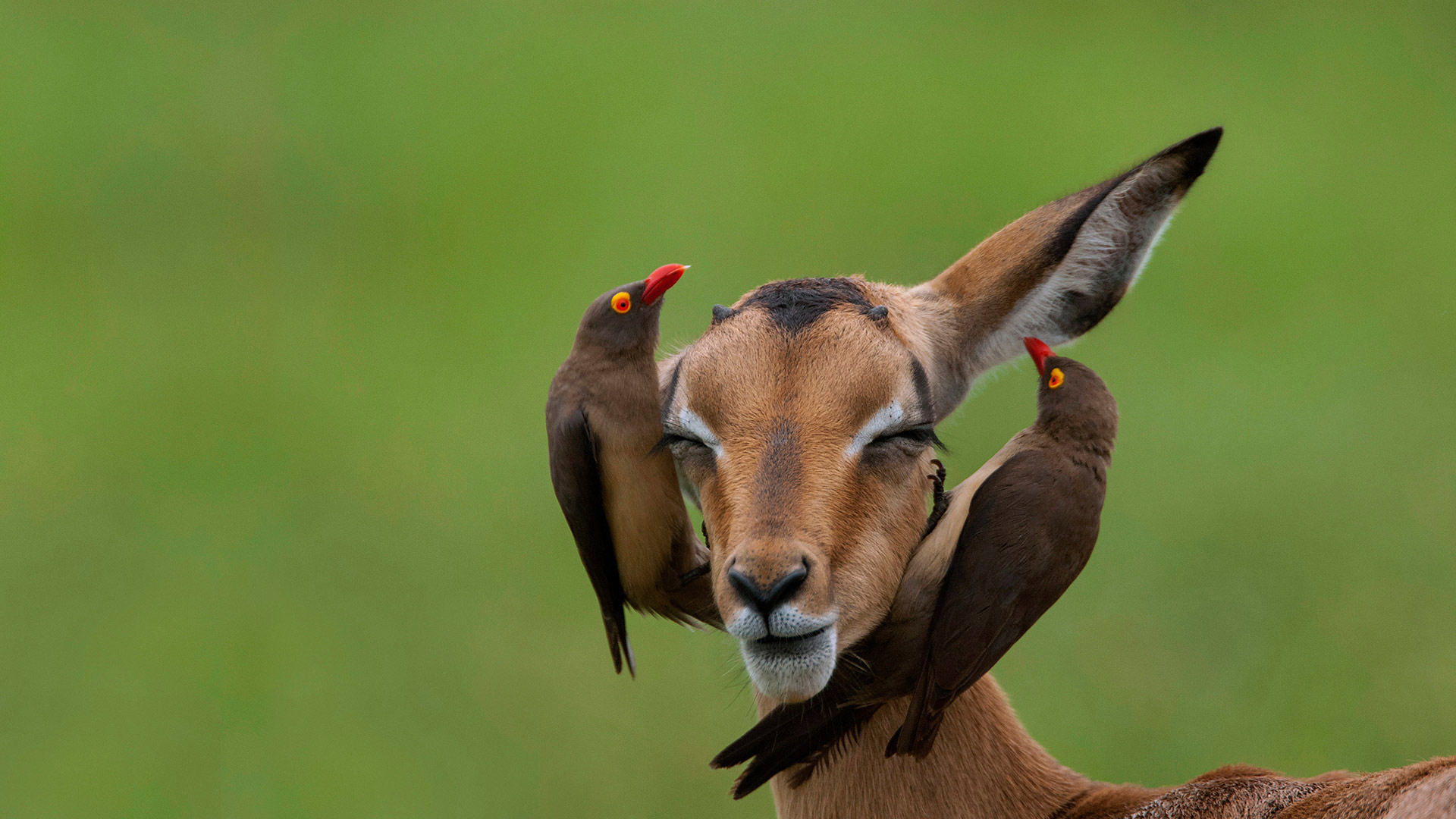Red-billed oxpeckers on an impala in Mpumalanga, 南非 (© Heini Wehrle/Minden Pictures)