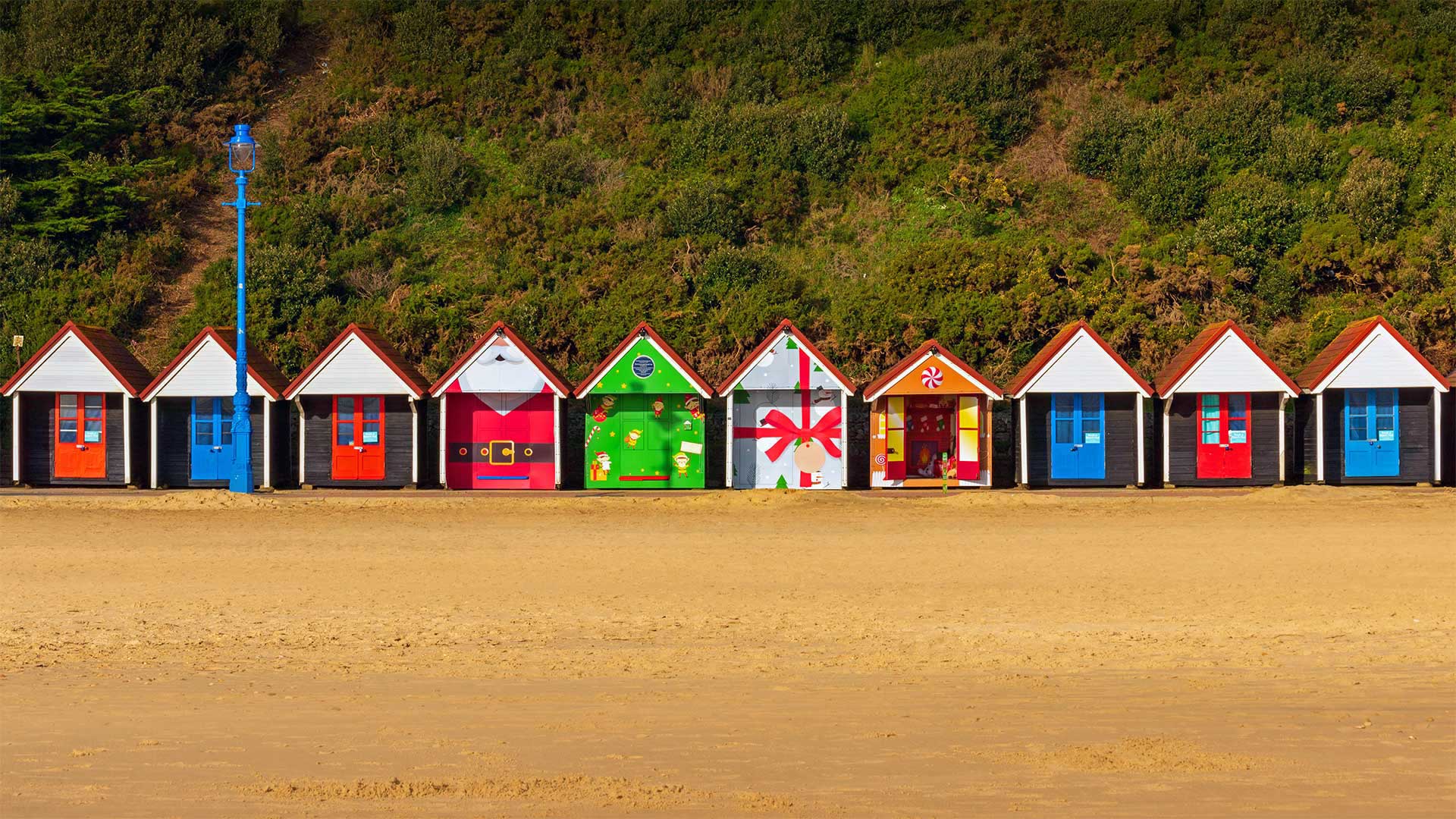 Christmas-themed beach huts in Bournemouth