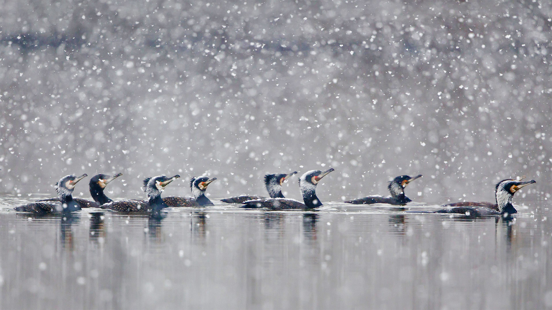 Great cormorants gliding through a snowstorm in Hesse, 德国 (© Wilfried Martin/盖蒂图片社)