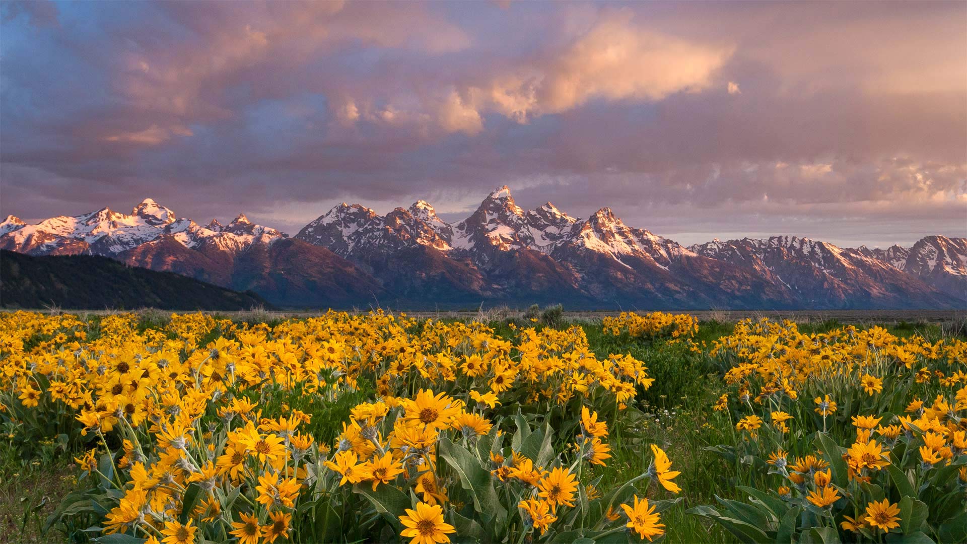 Balsamroot wildflowers bloom below the Teton Mountains in Grand Teton National Park, 怀俄明州 (© Mike Cavaroc/Tandem Stills + Motion)